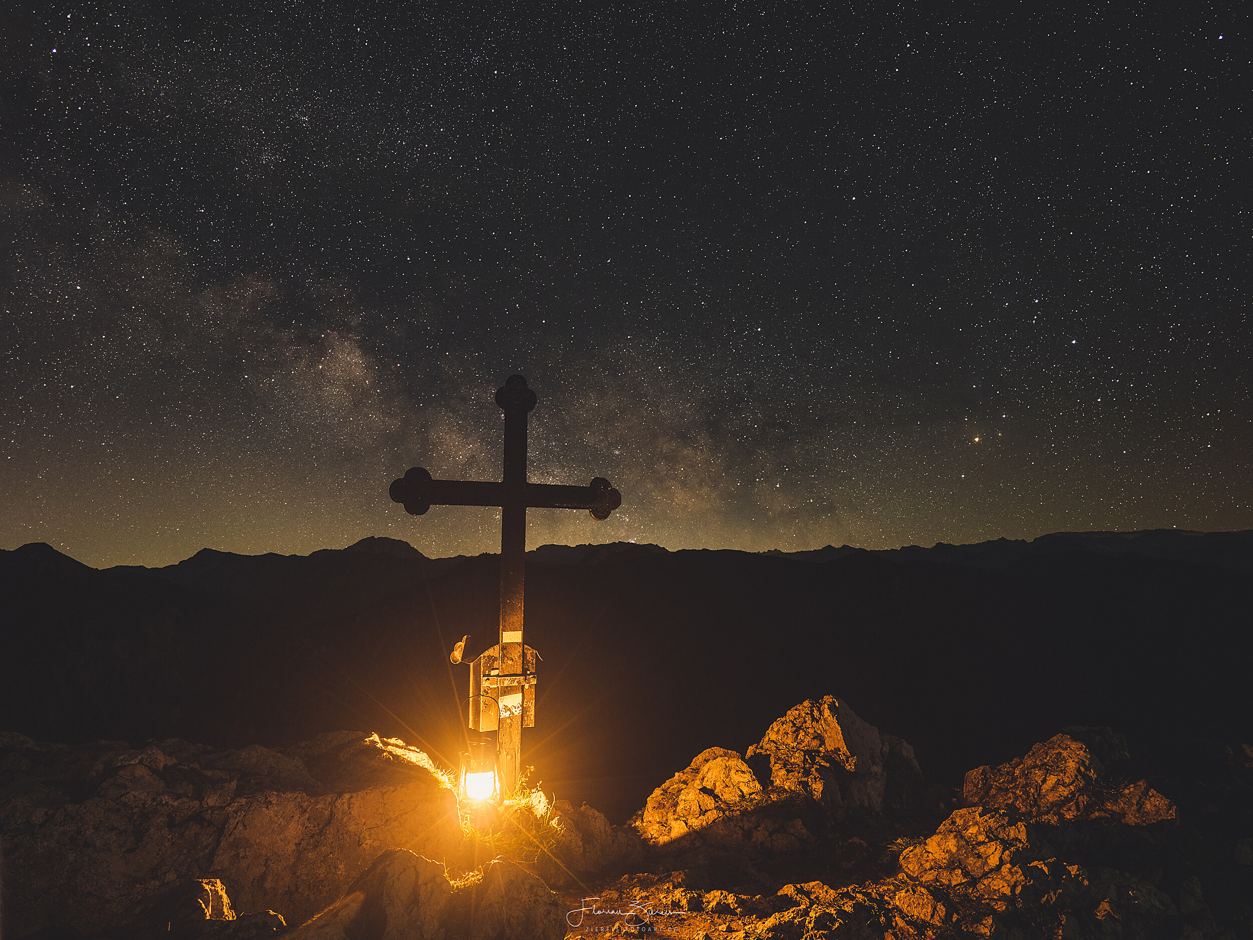 Gipfelkreuz mit Milchstraße und Vollmond zur Mondfinsternis am Hirschhörnlkopf